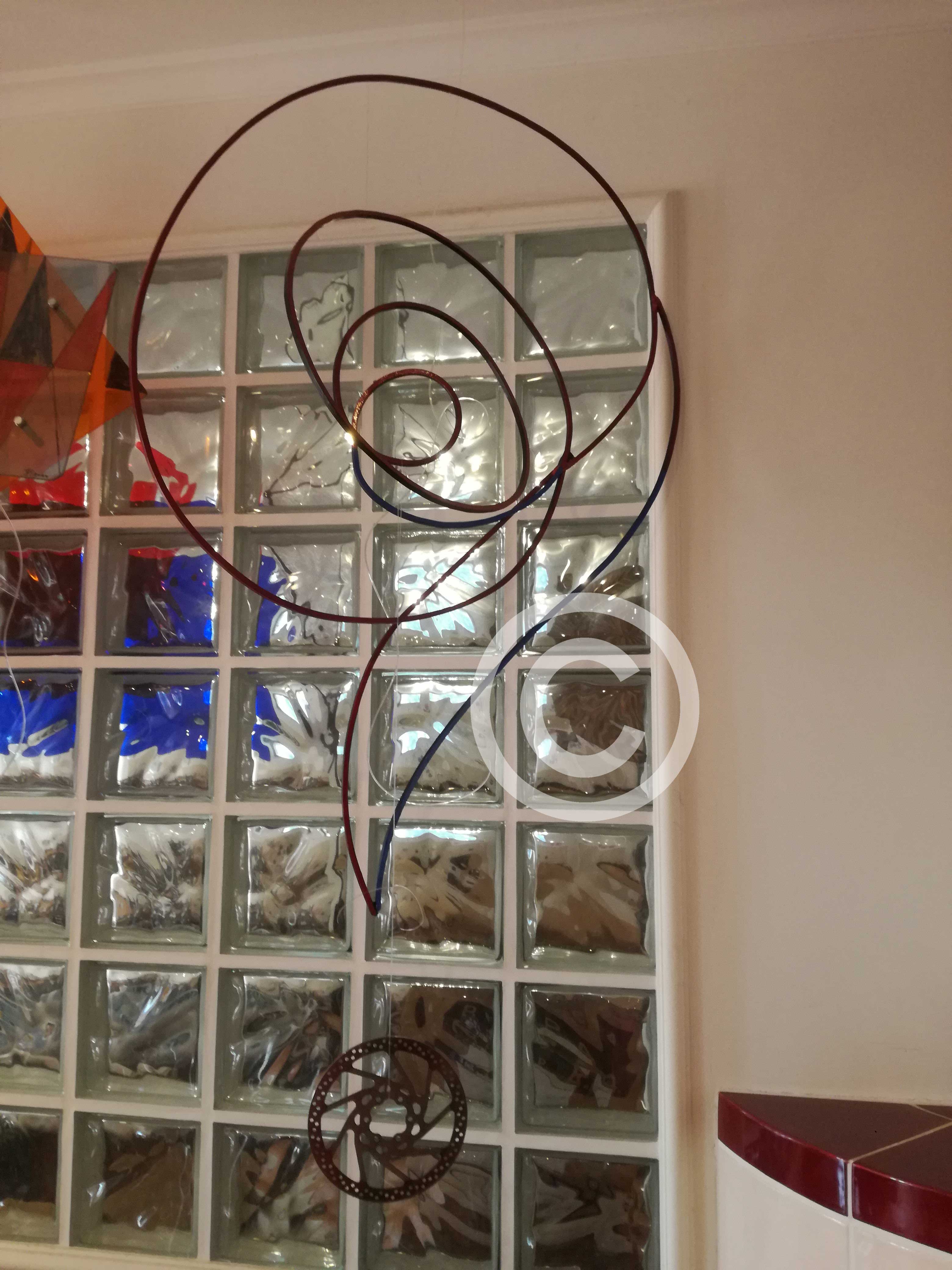 L’Universo è visto come pensiero creativo. Nell’installazione ci sono due sculture realizzate con quadrelli di ferro piegati, saldati e colorati. Le opere sono una stella ed una galassia; quest’ultima è anche un grande punto interrogativo che rappresenta un’incognita, una domanda, qualcosa che ci sfugge. Ci sono poi delle parole e degli oggetti scelti per cogliere le differenze tra l’Universo che conosciamo ed invece l’opera “Il mio universo”.
