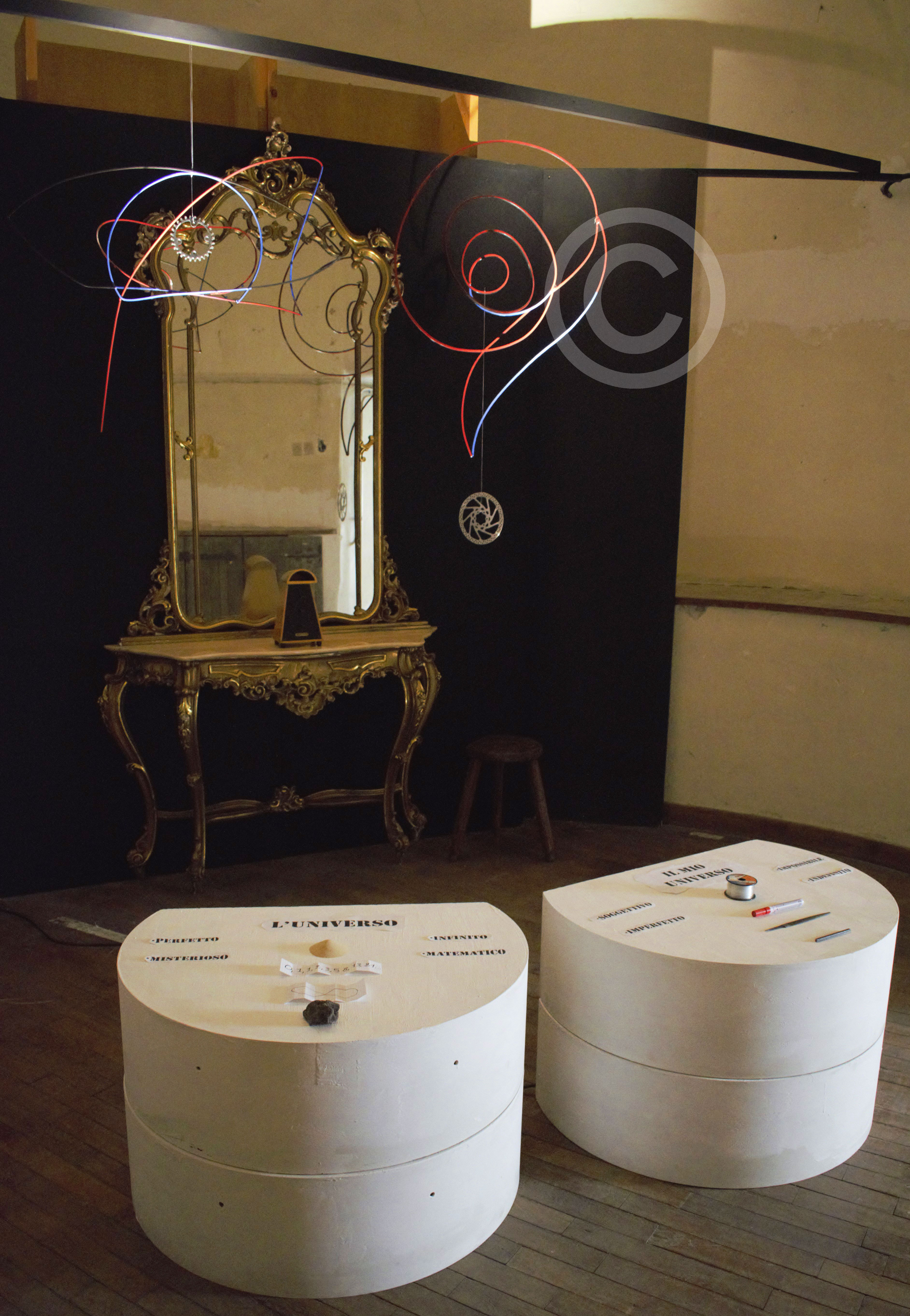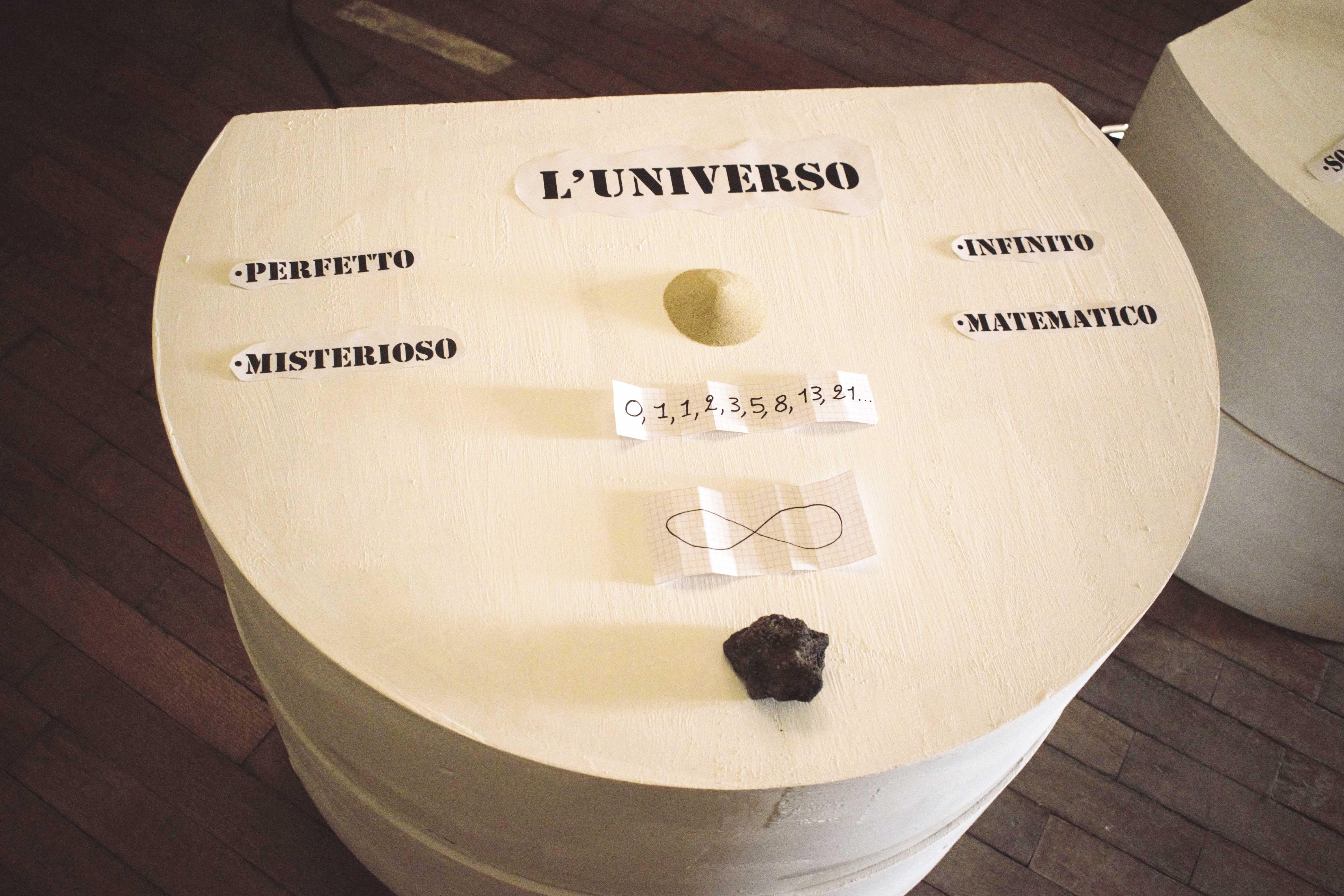 L’Universo nell’installazione è definito con degli aggettivi scritti su carta (perfetto, misterioso, infinito, matematico) ed è anche rappresentato da alcuni oggetti (pietra, sabbia, appunti con segno infinito, appunti con successione numeri Fibonacci).